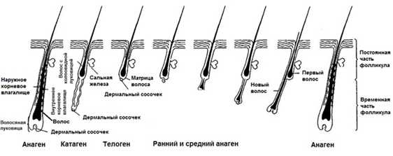 Понимание цикла роста волос также является важным фактором при лазерной эпиляции. Четырьмя циклами роста волоса являются анаген, катаген, телоген и экзоген. Анген — активная фаза роста волоса. В этой фазе начинается синтез меланина и рост стержня волоса и к концу этой фазы в волосяных фолликулах присутствует наибольшее количество меланина и волос проникает в кожу наиболее глубоко. Катаген — фаза отдыха, когда рост волоса и выработка меланина прекращаются. В фазе телогена волос начинает терять своё соединение с дермальным сосочком и уменьшается в размерах. В конце фазы телогена волос в конце концов выпадает из волосяного фолликула и фолликул входит в фазу экзогена. Фолликул без волоса остаётся в состоянии покоя до начала новой фазы роста анагена. Волос наиболее восприимчив к лазерной световой энергии с начала до середины фазы анагена, когда волосяной фолликул сформировал достаточное количество меланина, но до того момента, как у волоса появляется возможность проникнуть вглубь дермы.